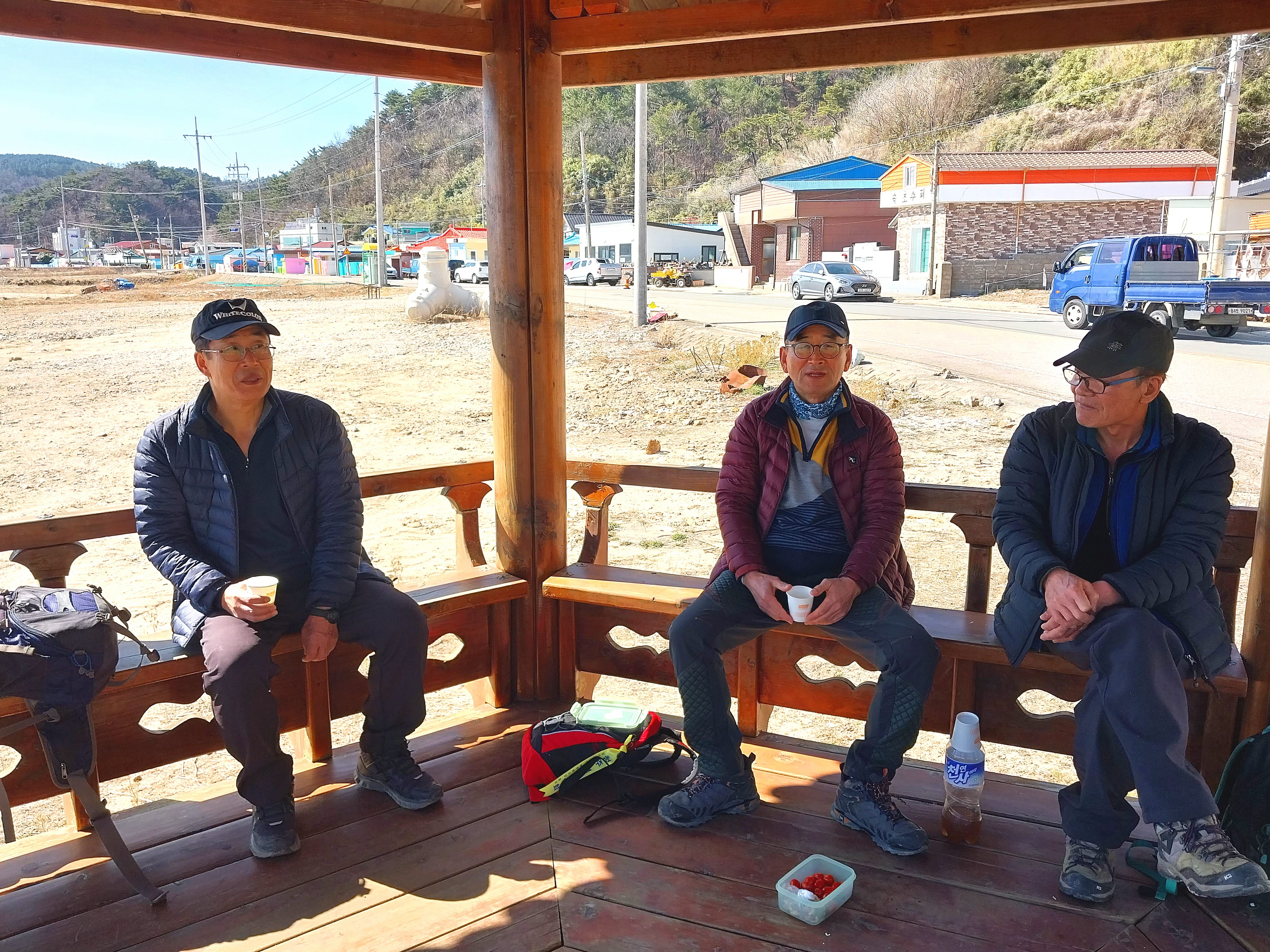 ▲회를 드실분들은 횟집으로 가고 나머지 분들은 총무님이 준비한 튀김닭을 안주로 하산주를 한잔씩하며 피로를 풀어 냅니다.