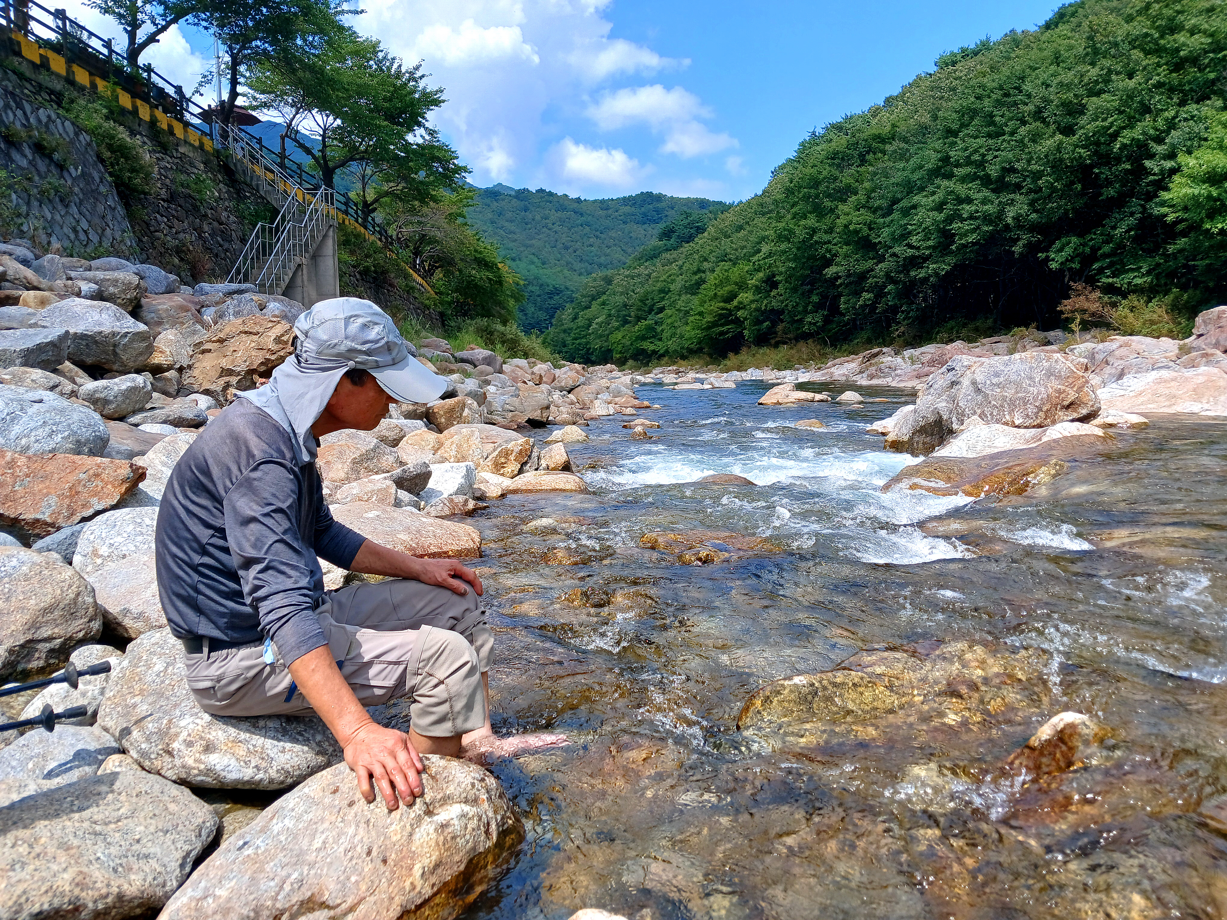 ▲그늘은 아니지만 계곡물에 발을 담그고 명상에 잠겨 봅니다.