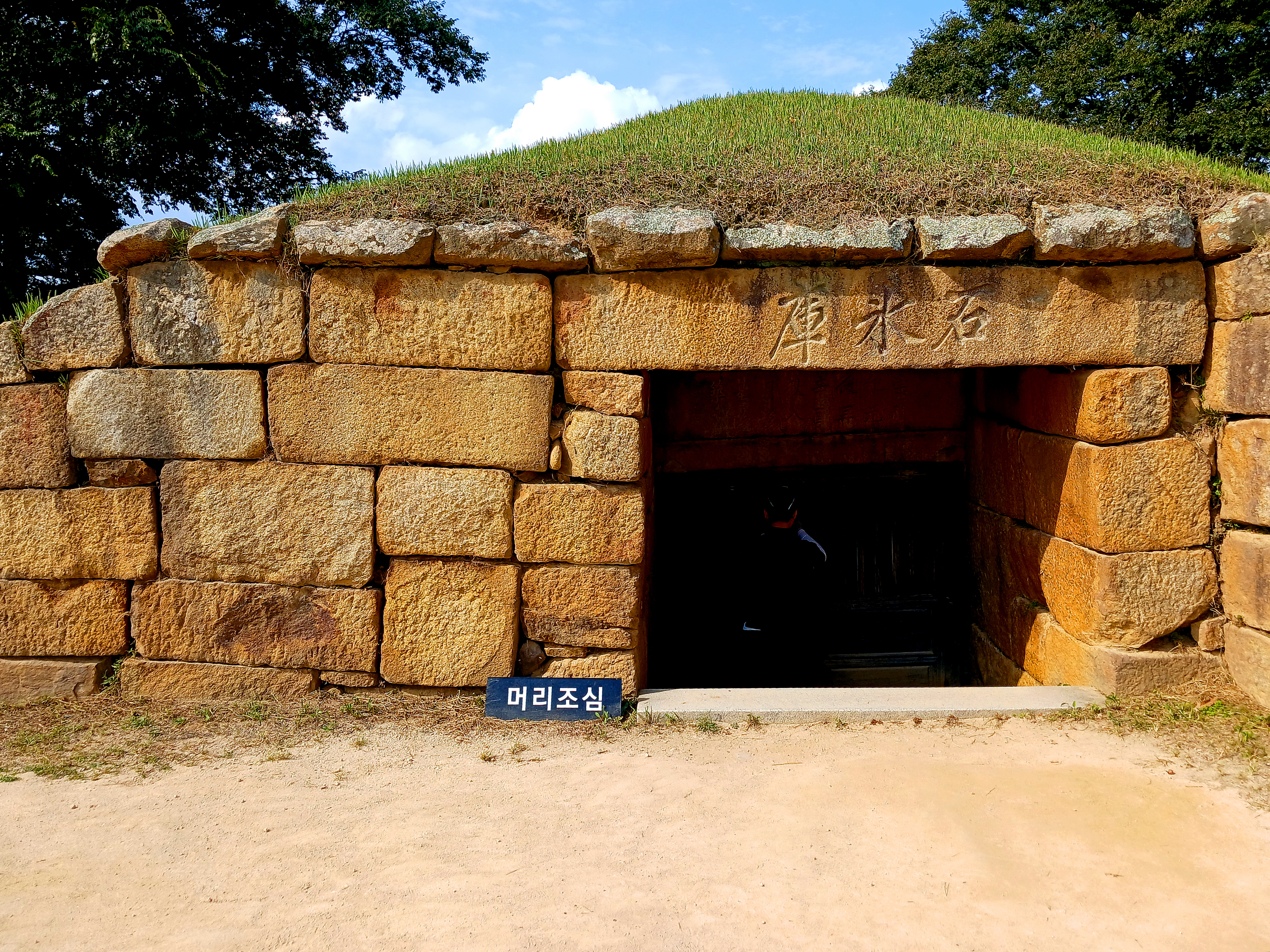 그리고 주실 입구의 좌우 2개의 기둥위에 작은 가로보 석재가 이때는 보이지 않는다.