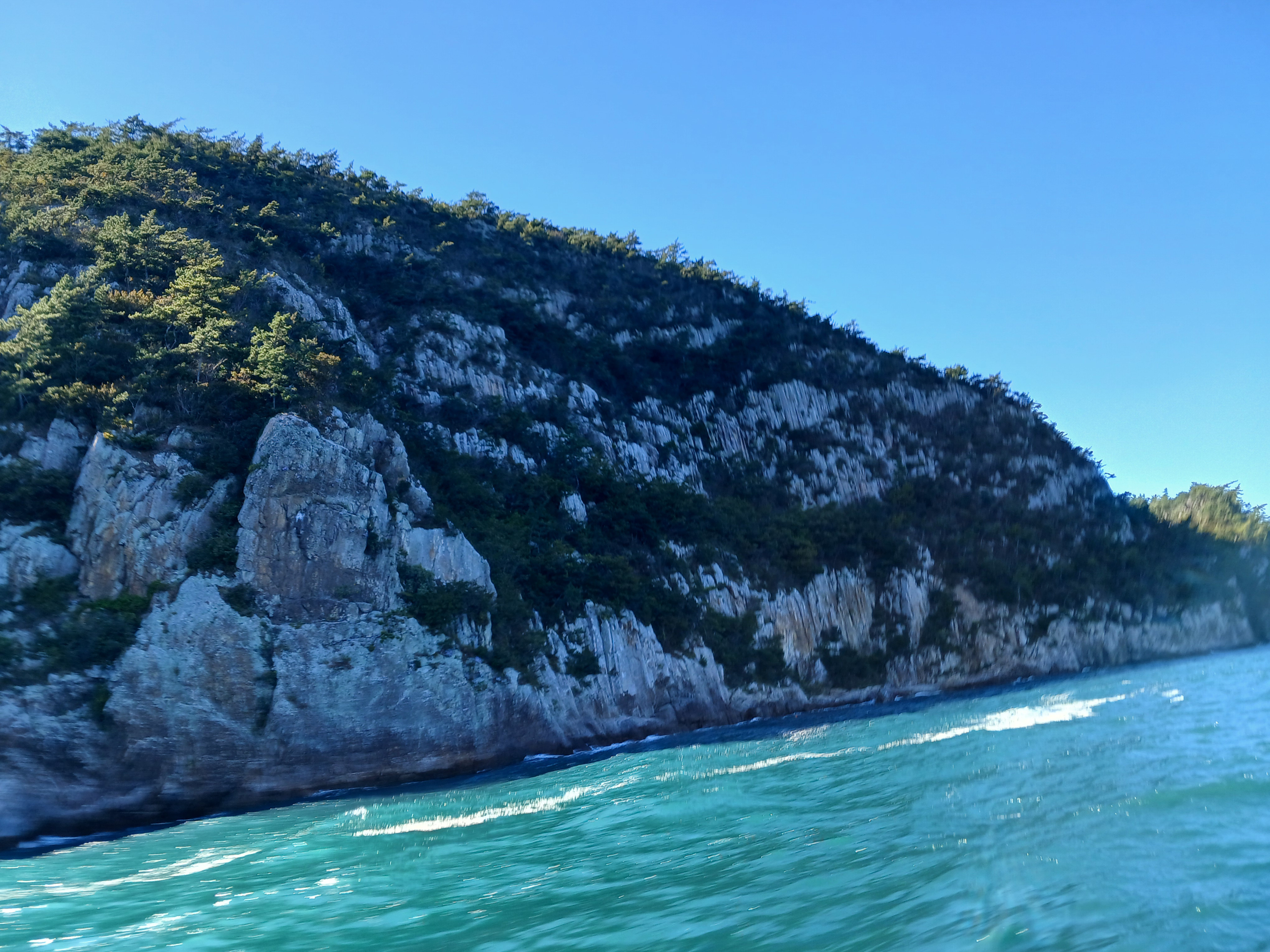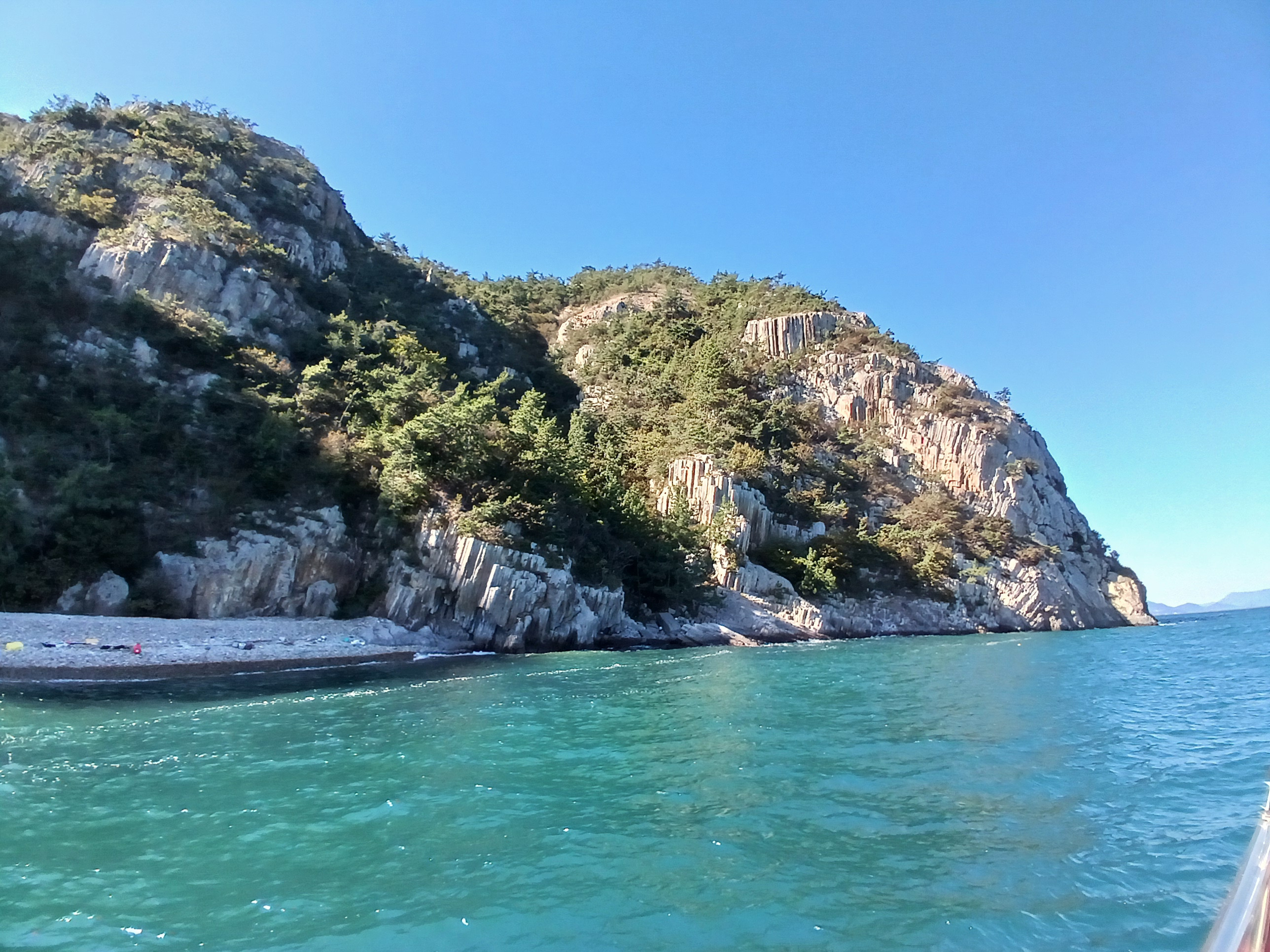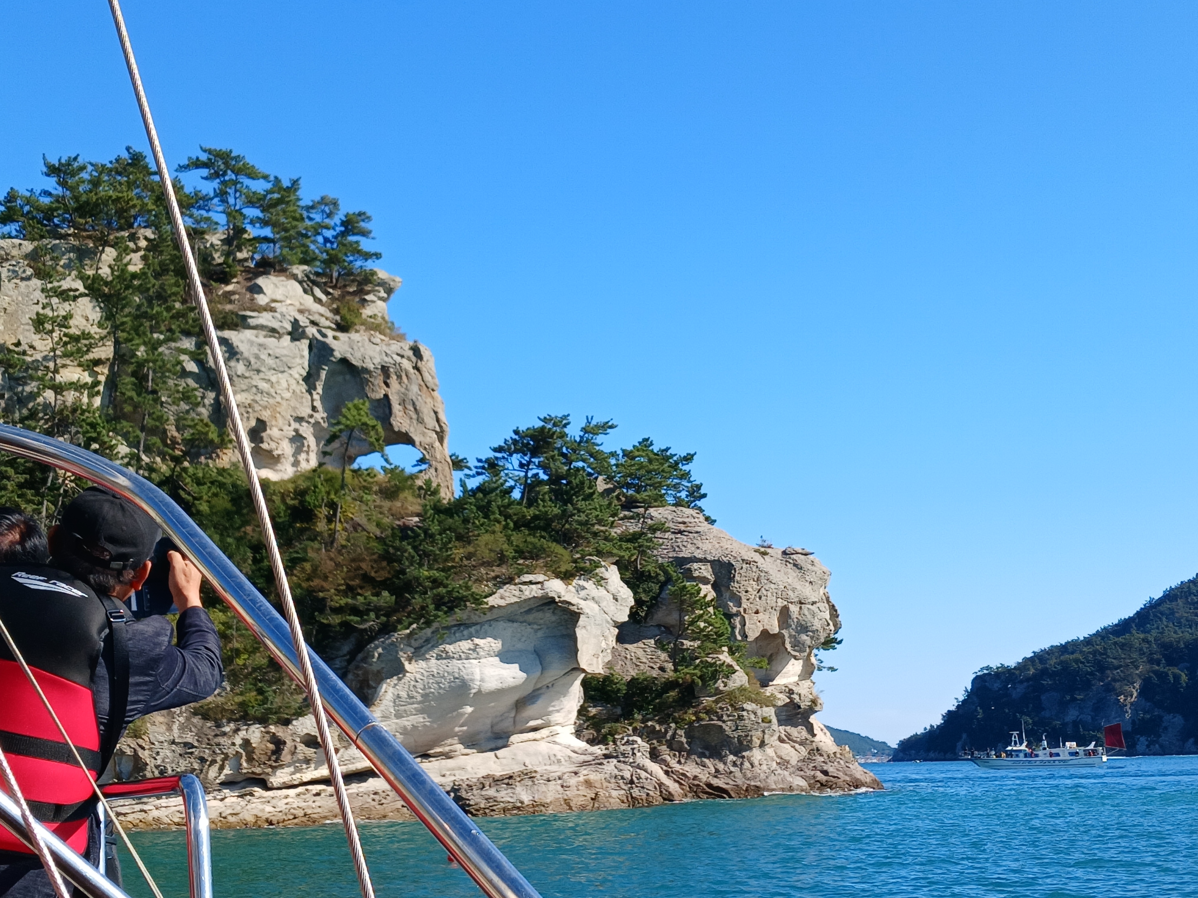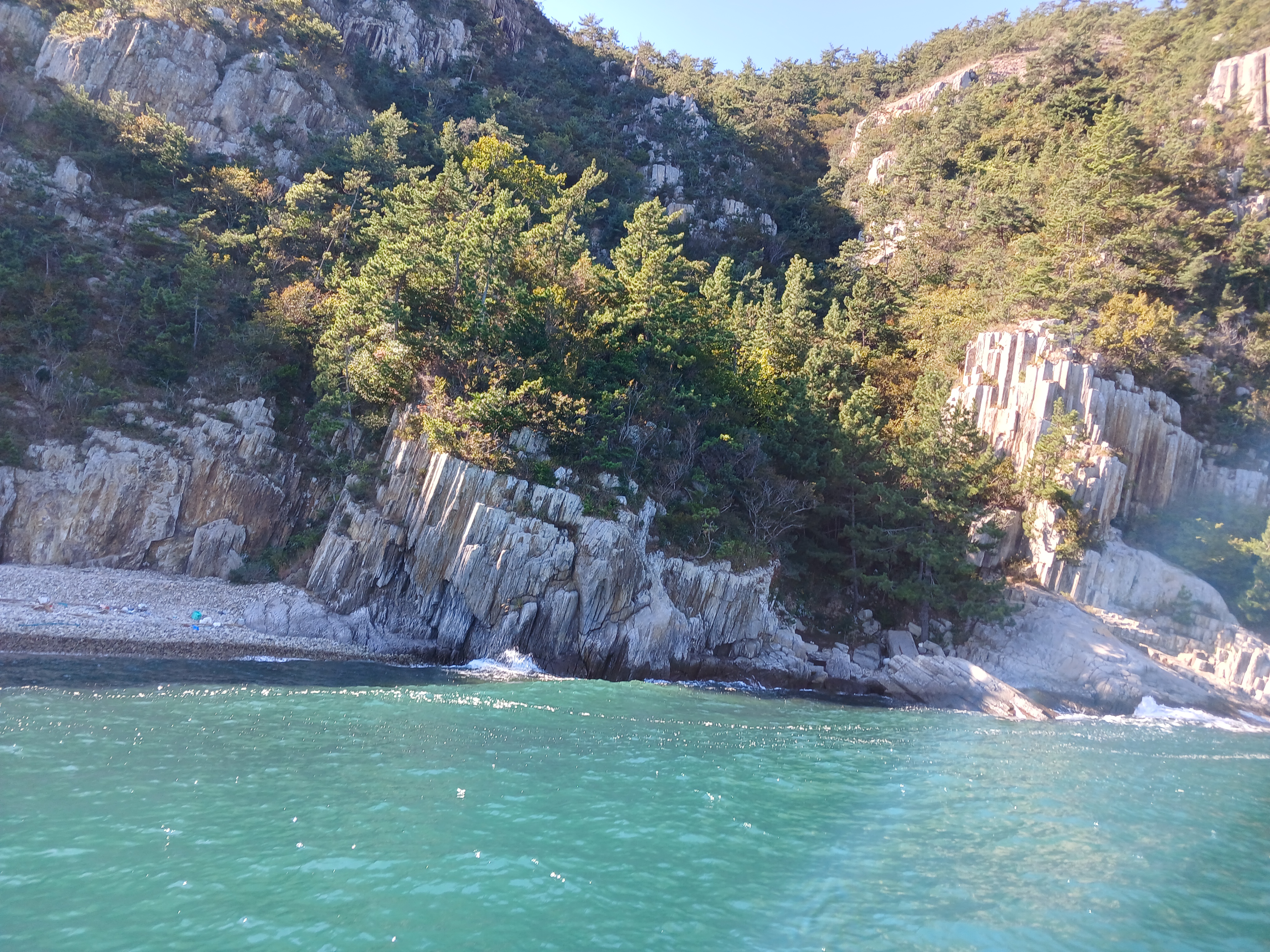 ▲ 조금만 더 윗쪽으로 돌아가면 부채바위와 병풍바위가 보인다는데 이쪽은 풍랑이 세어서 위험하여 그만 돌아 내려갑니다.