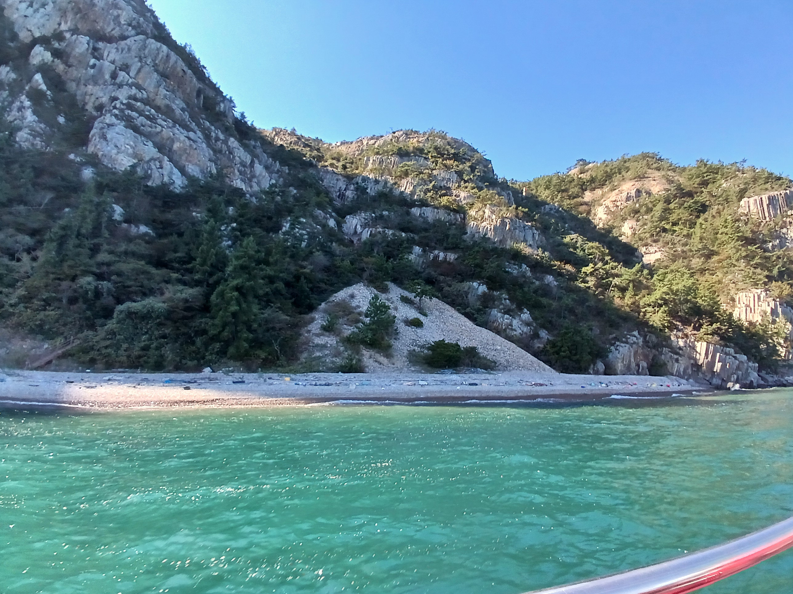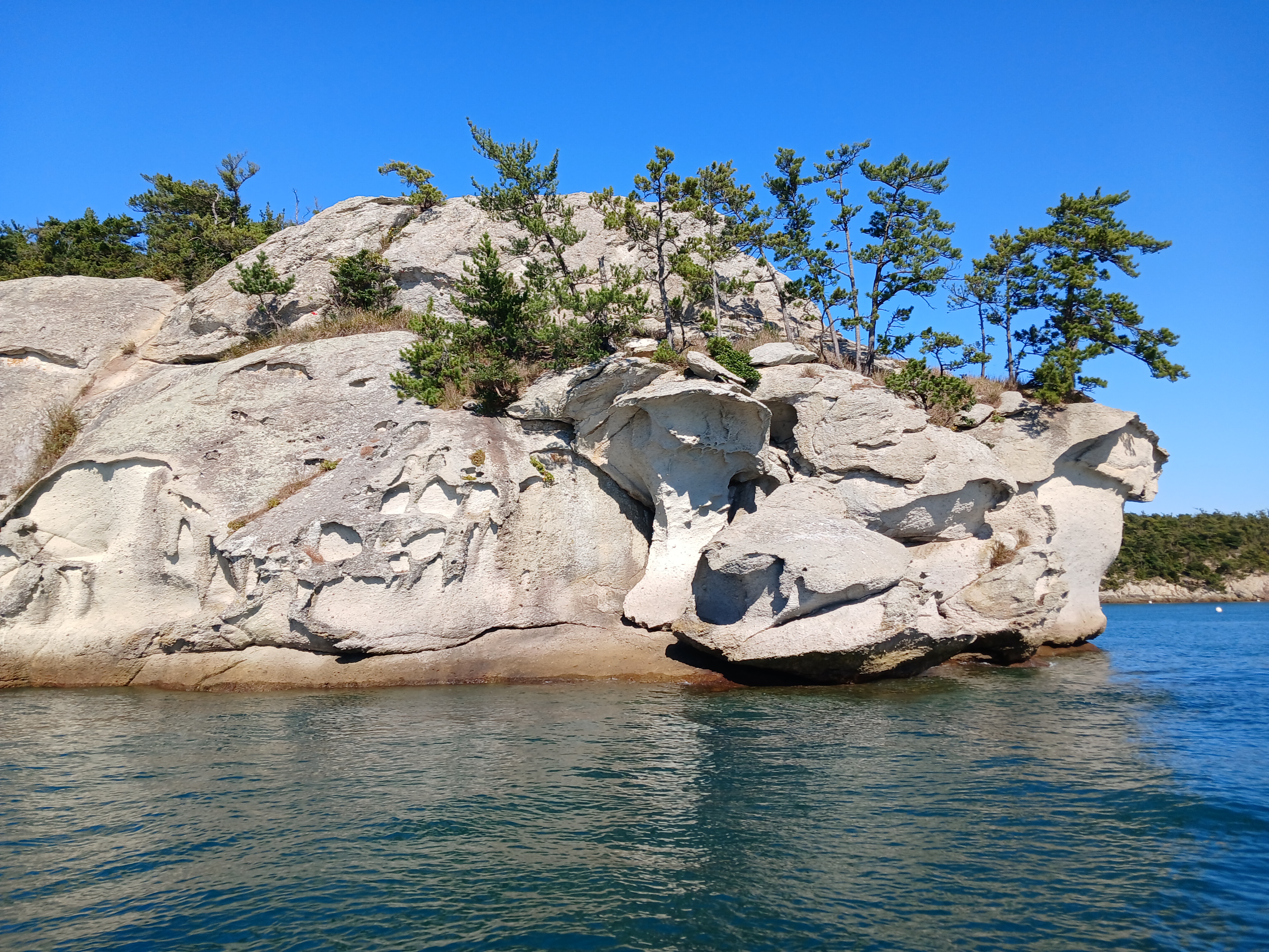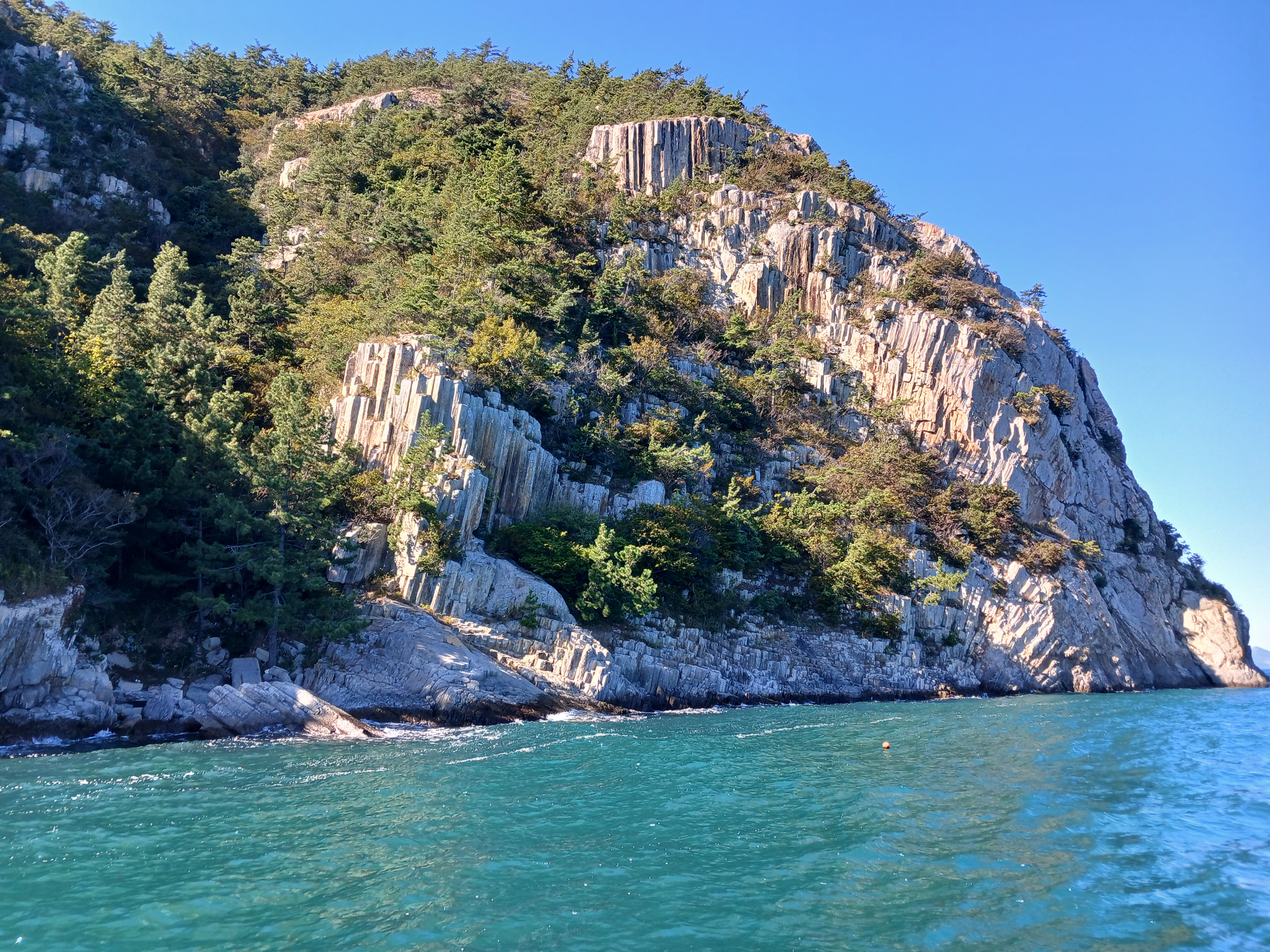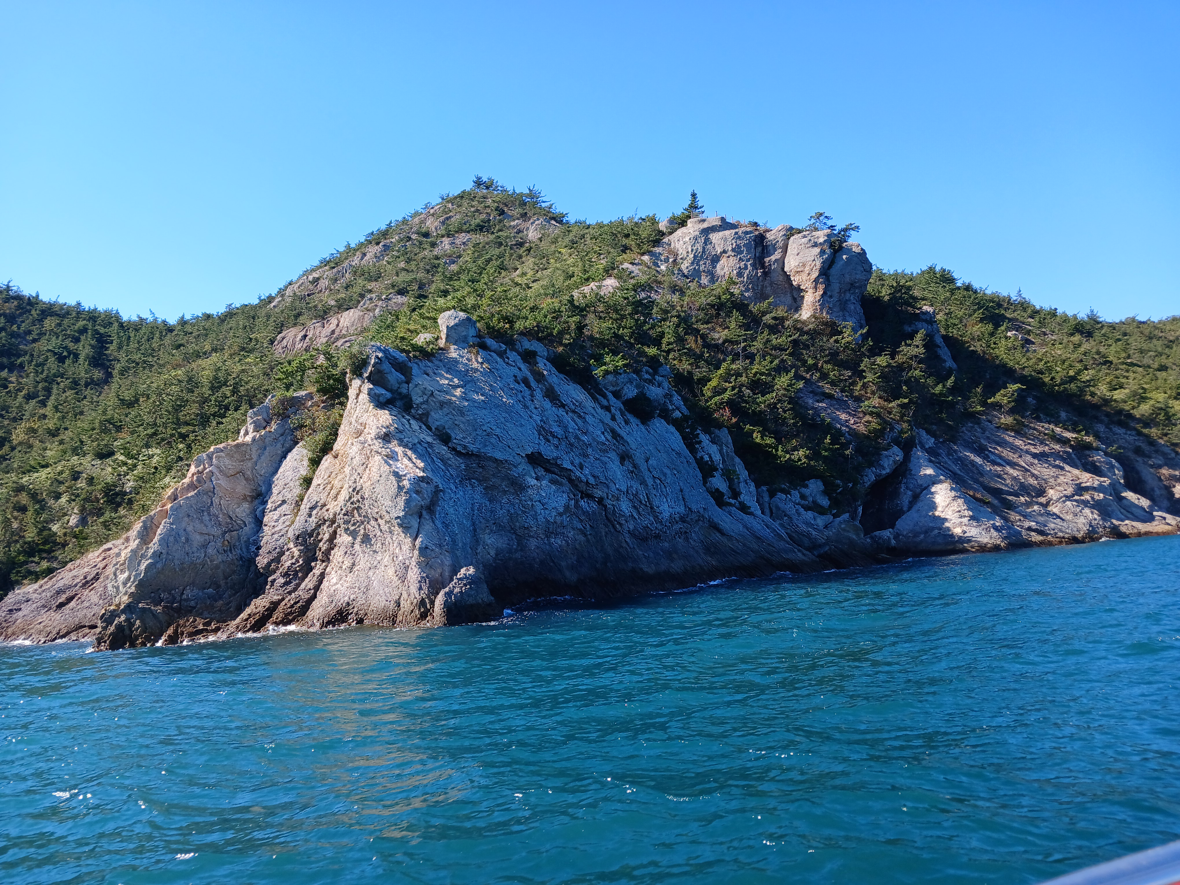 ▲ 조금만 더 윗쪽으로 돌아가면 부채바위와 병풍바위가 보인다는데 이쪽은 풍랑이 세어서 위험하여 그만 돌아 내려갑니다.