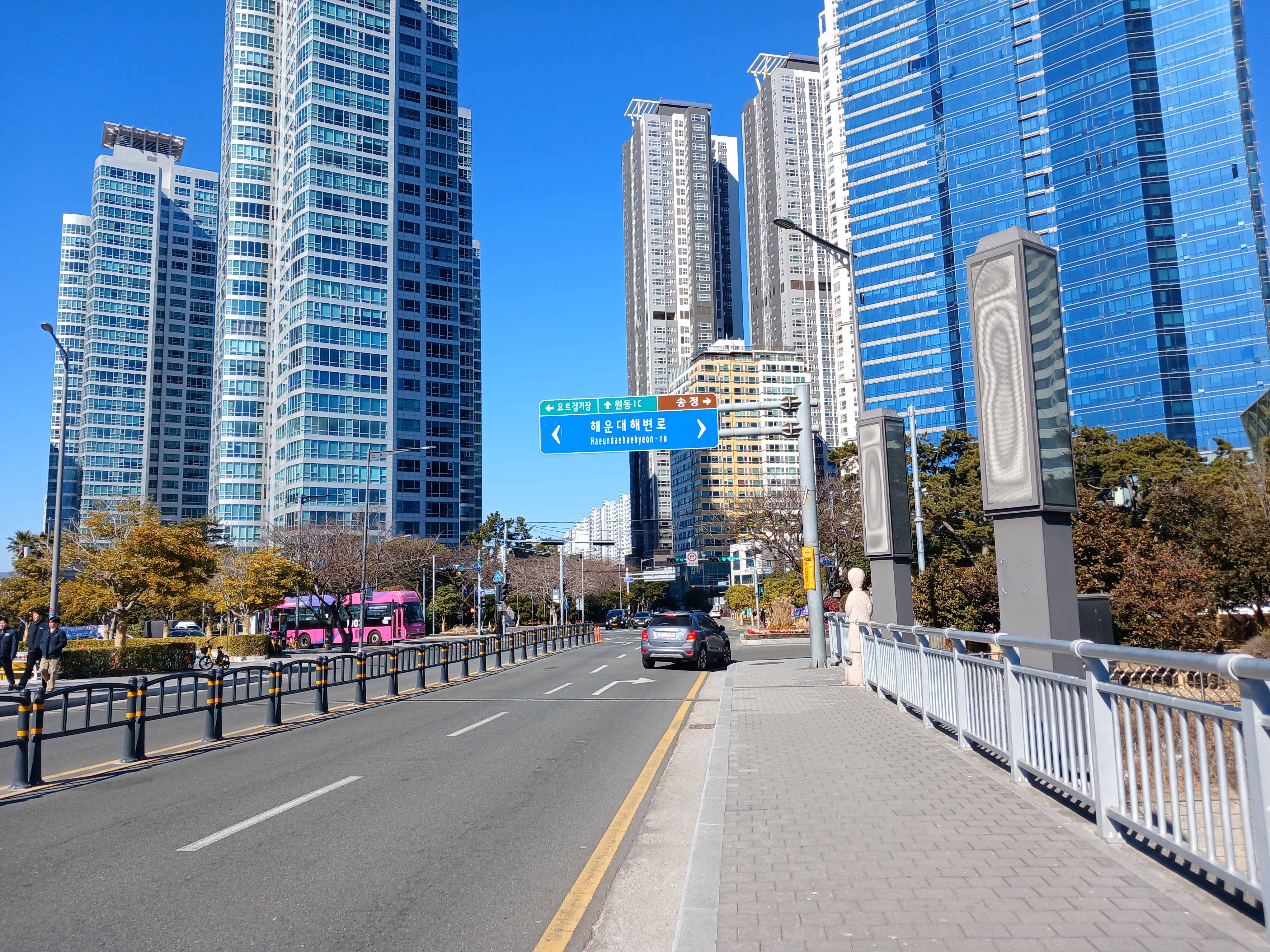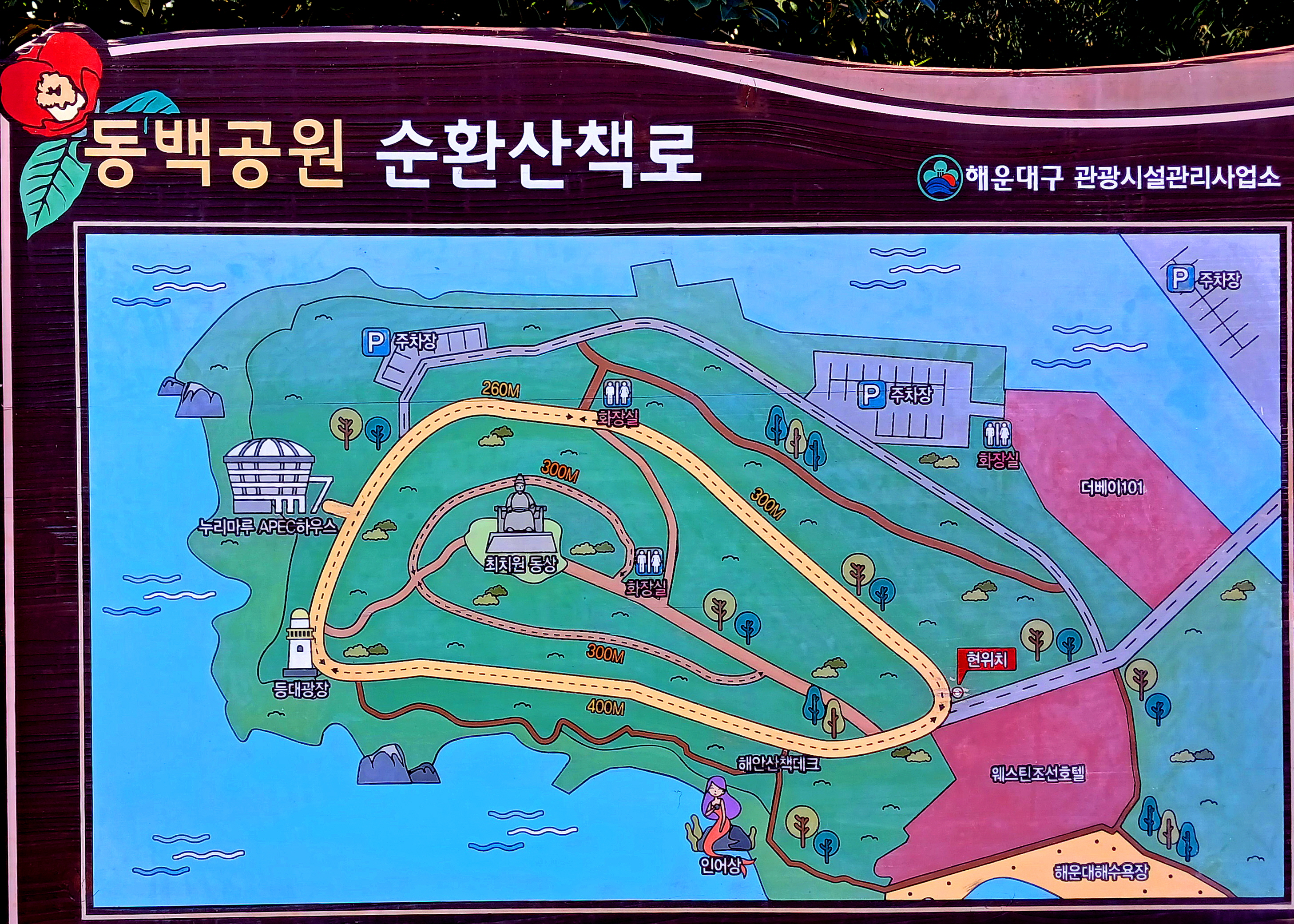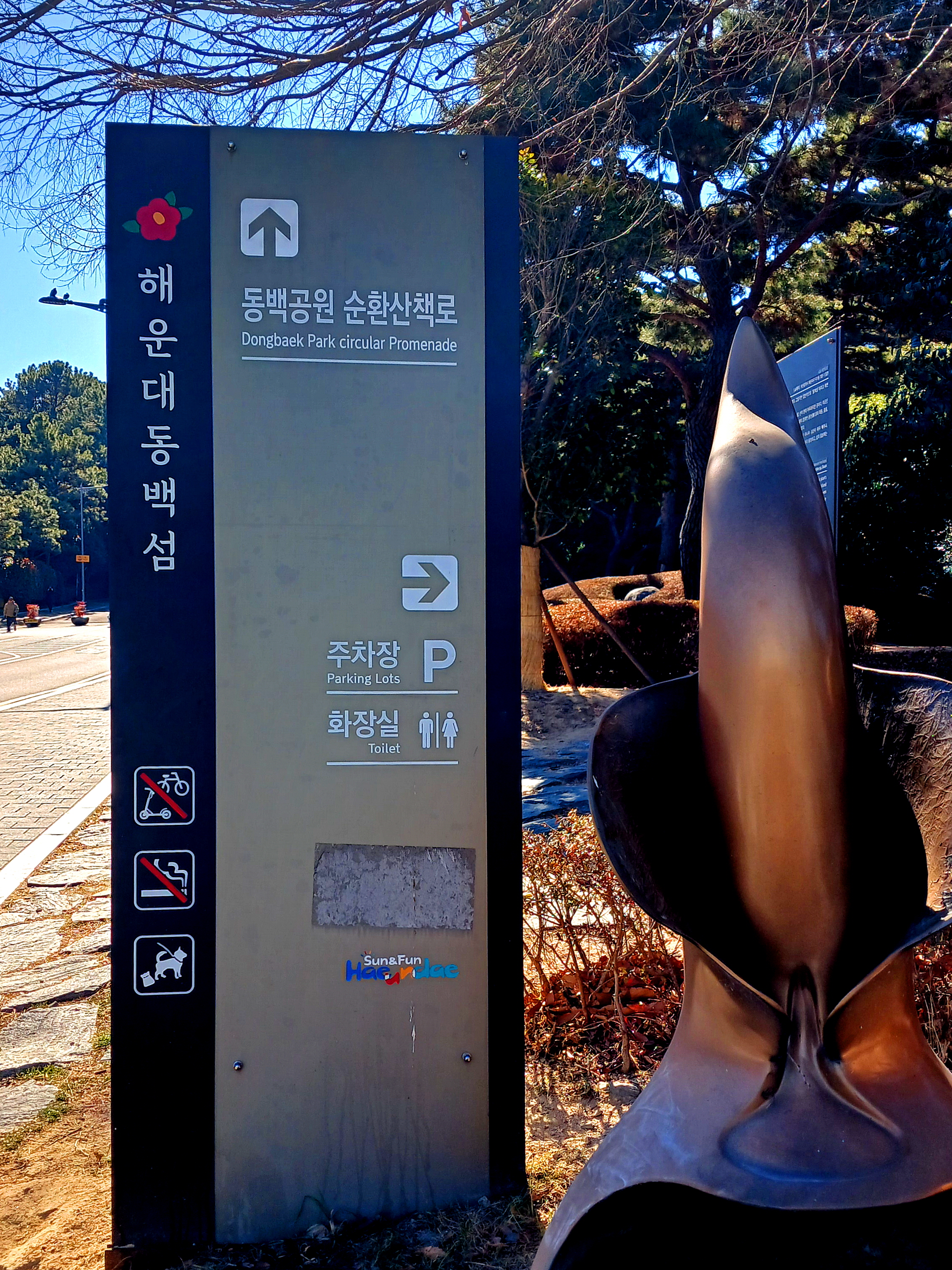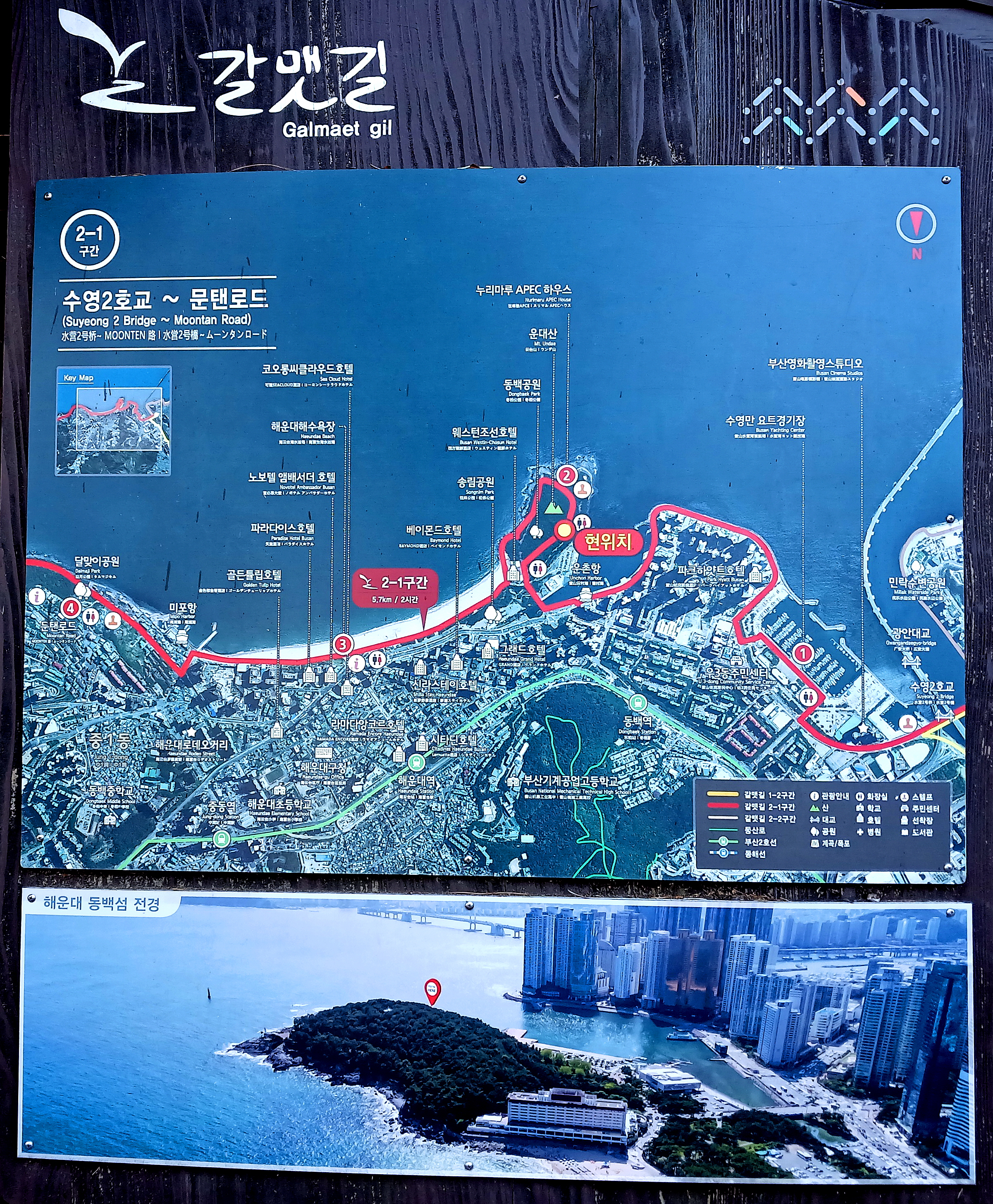 ▲ 우측으로 직진하면 동백섬으로 가고 길을 건너 좌측으로 직진하면 갈맷길입니다.