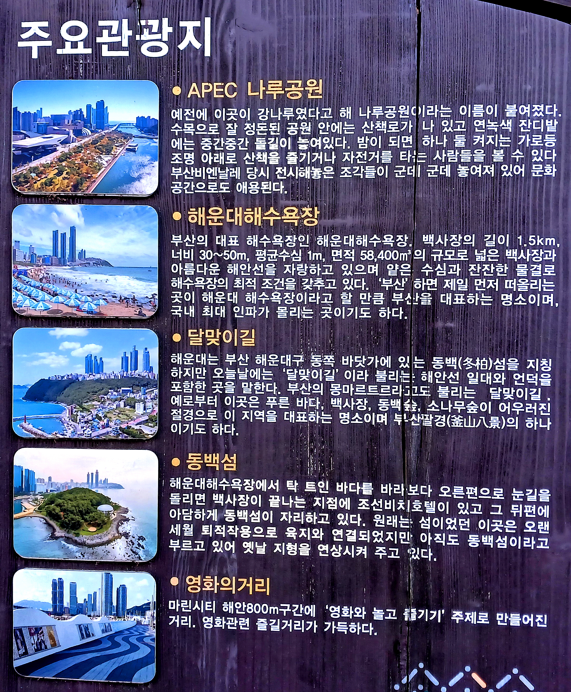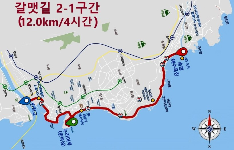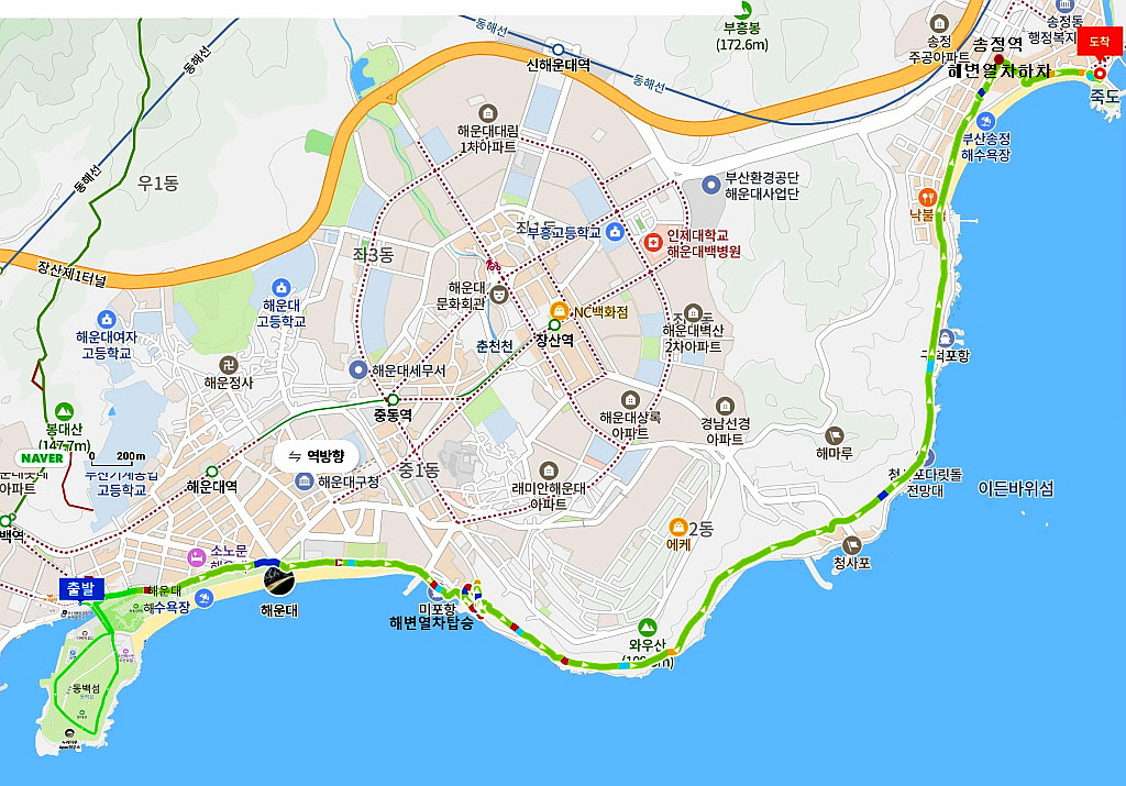 ▲갈매길 2-1코스중 민락교~동백섬 구간은 생략하고 동백섬 앞에서 버스를 내려 동백섬을 돌아보고 미포까지 와서 해변열차를 타고 송정역까지 왔습니다.