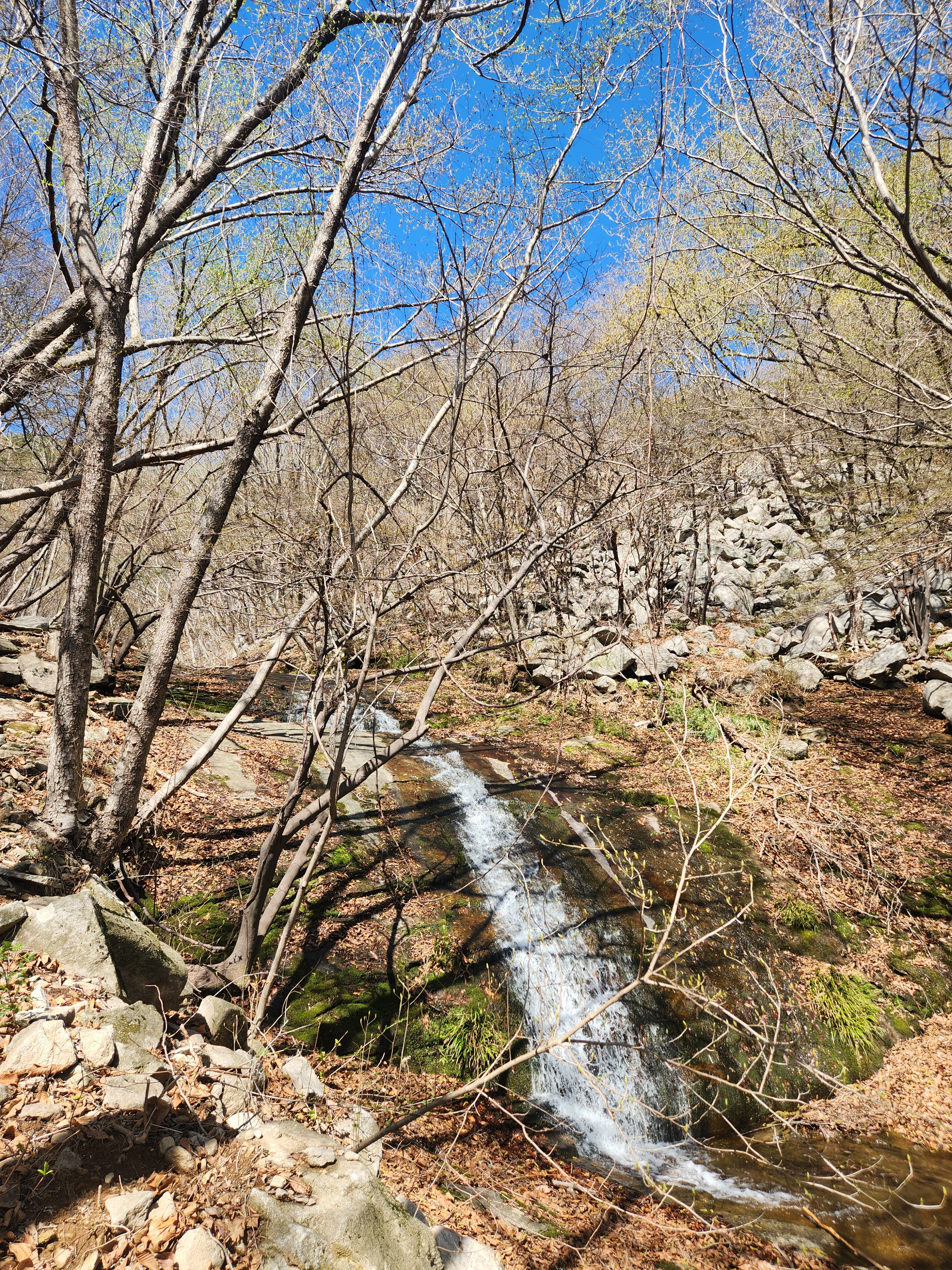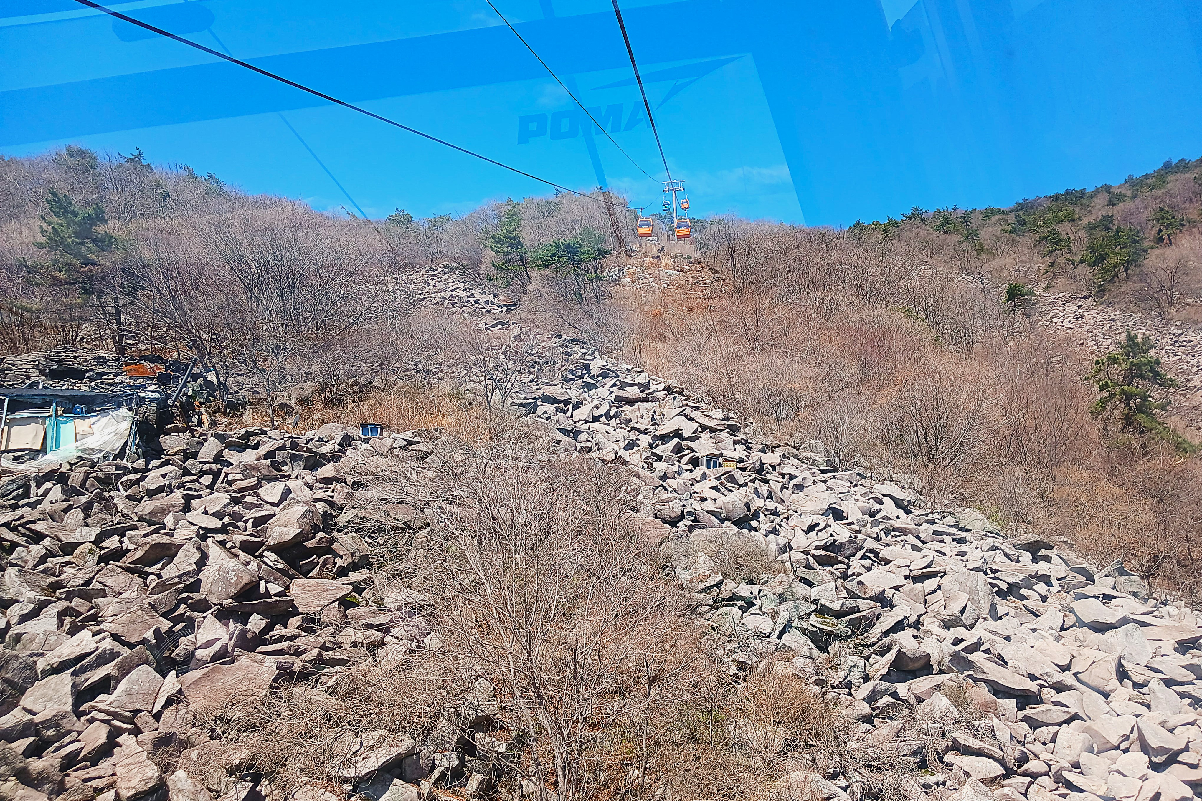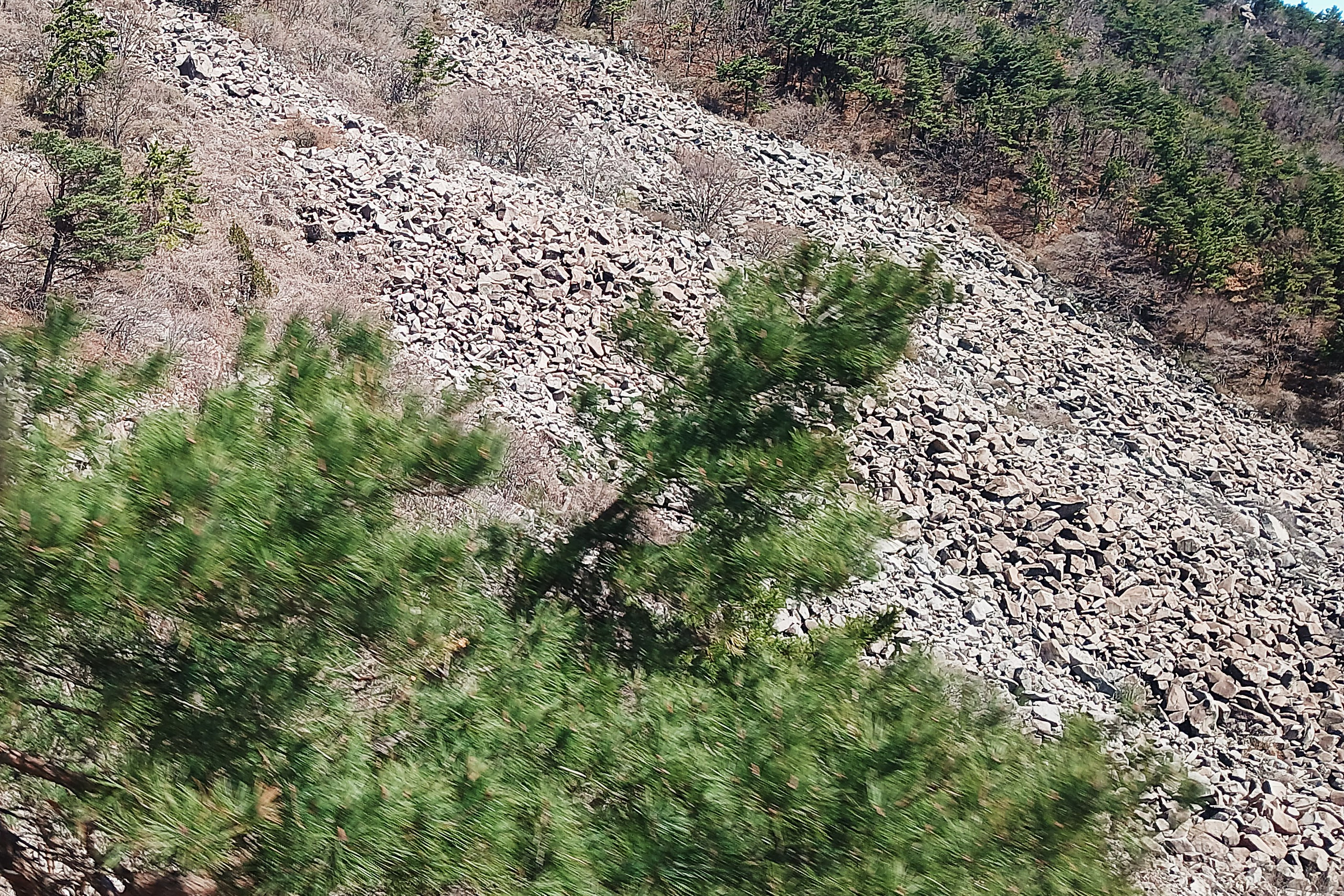 ▲ 산 비탈에는 돌무더기가 너덜겅을 이루고 있습니다. 정상쪽에 솟아있던 암벽이 빙하기를 거치면서 부서져 내린 것이라지요.